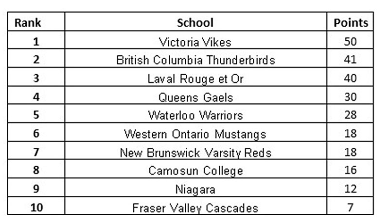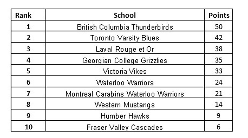 The Ontario University Association champion Toronto Varsity Blues (41 points) came second, followed closely by the RSEQ champion Laval Rouge et Or (40 points). The Canadian College Athletics Association champion Georgian College Grizzles (35 points), and Victoria Vikes (33 points) round out the top 5.